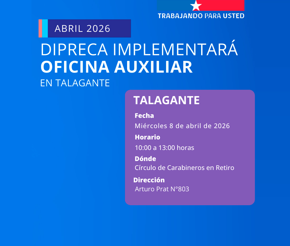 Una nueva jornada de “Oficina Auxiliar de DIPRECA” se efectuará en Talagante —miércoles 8 de abril de 2026— acercando los servicios institucionales a beneficiarios de la comuna.